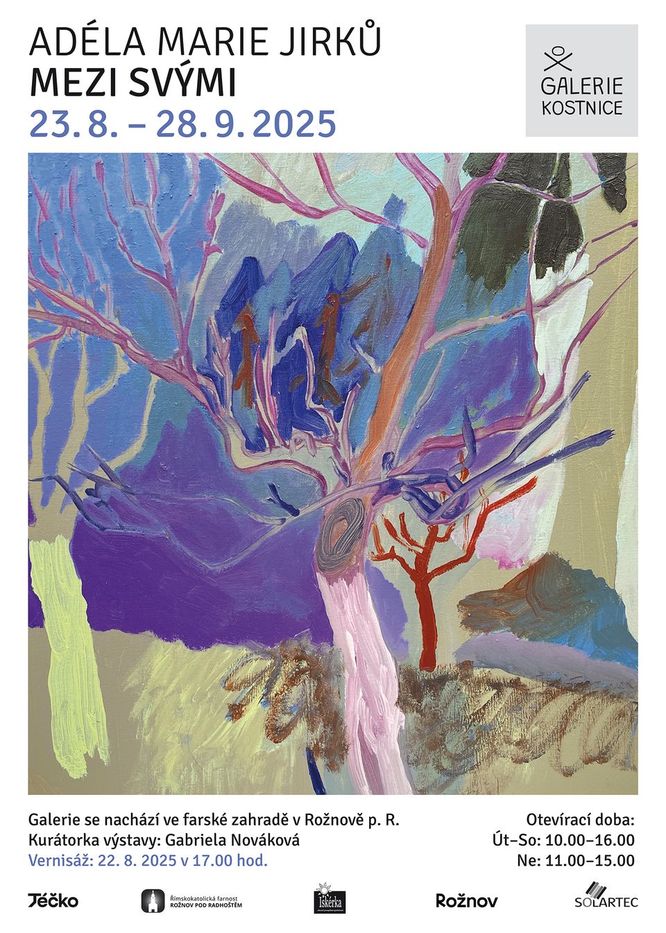 Malířka, ilustrátorka a spisovatelka Adéla Marie Jirků pro svou výstavu v Galerii Kostnice připravila nové práce z převážné většiny vytvořené přímo pro tento prostor. V expresivních malbách, které jsou zároveň plné podmanivé romantické atmosféry, přináší své vnímání valašské krajiny, svůj niterný a hluboce prožitý pohled na místa, která důvěrně zná a která jsou jí velmi blízká. S kočičkou Vatou, s tužkami, pastely a barvami, s ještě bílými, ale i s rozmalovanými plátny pendluje Adéla mezi Prahou a Horní Bečvou.