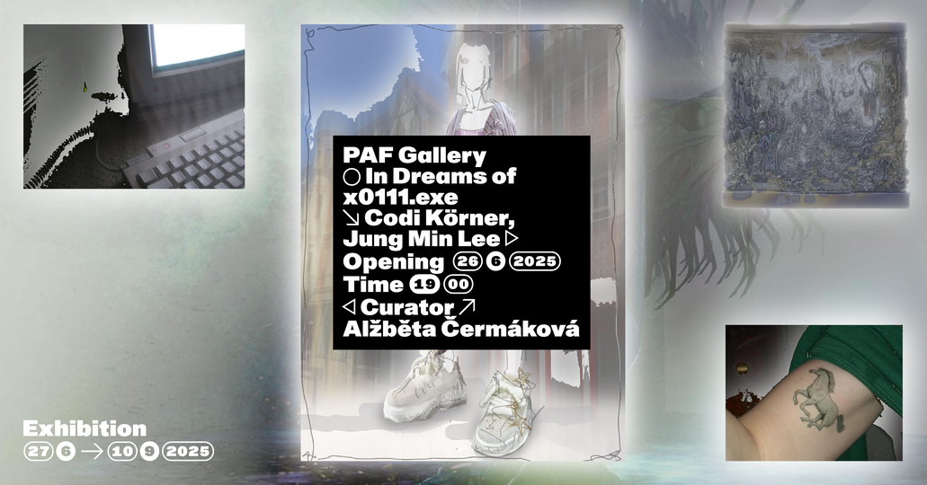Výstava In Dreams of x0111.exe se zabývá tématem vzpomínek, paměti a stesku po minulém uložených v předmětech a obrazech, s nimiž zažíváme silný pocit nostalgie a zároveň odcizení. Visí v prostoru a jsou jako snovou liminální počítačovou hrou z roku 2005. Je možné, že ani nejsou naše, a přesto je prožíváme. Na této výstavě takovou zkušenost nabízí tvorba berlínského umělectva Codi Körner a Jung Min Lee. Textilní sochy Körner tvoří jakýsi hypertextový obraz dávno zapomenutých snů a fungují jako propojené kroniky, které Körner provázely různými kapitolami života. S těmito sochami se pak proplétají a vystupují z nich dystopické obrazy minulosti s mytickou postavou harpyje berlínské malířky Jung Min Lee.