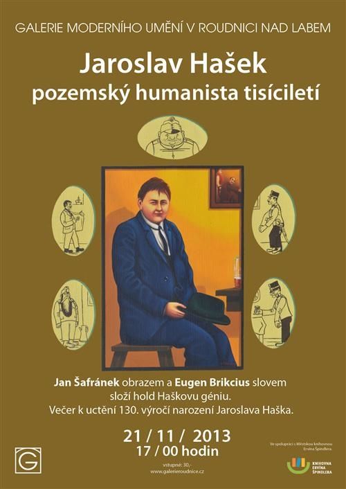Jan Šafránek obrazem a Eugen Brikcius slovem složí hold Haškovu géniu. Večer k uctění 130. výročí narození Jaroslava Haška. Ve spolupráci s Městskou knihovnou Ervína Špindlera.