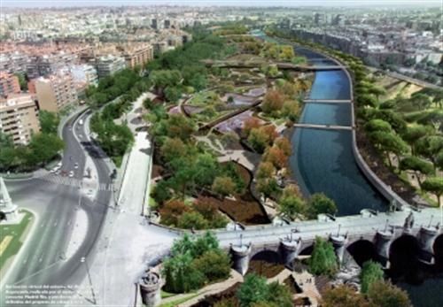 V roce 2003 se městská rada Madridu rozhodla zrevitalizovat veřejný prostor okolí řeky Manzanares, která protéká městem. Hlavní komunikace byla svedena do tunelu a na povrchu vzniklo takřka deset kilometrů nové městské zóny, na nichž bylo navrženo sto hektarů zelené plochy s veřejnými, sportovními a kulturními zónami: městskou pláží, hřišti, restauracemi, botanickou zahradou, divadelními, výstavními a koncertními prostory, bylo postaveno i několik zajímavých nových mostů. Revitalizace tak pomohla spojit i odlišné čtvrti města na protilehlých březích řeky. Na projektu spoluprovalo holandské studio West 8 a sdružení madridských ateliérů MRIO arquitectos /Burgos & Garrido Arquitectos Asociados, Porras La Casta Arquitectos a Rubio & Álvarez-Sala/.