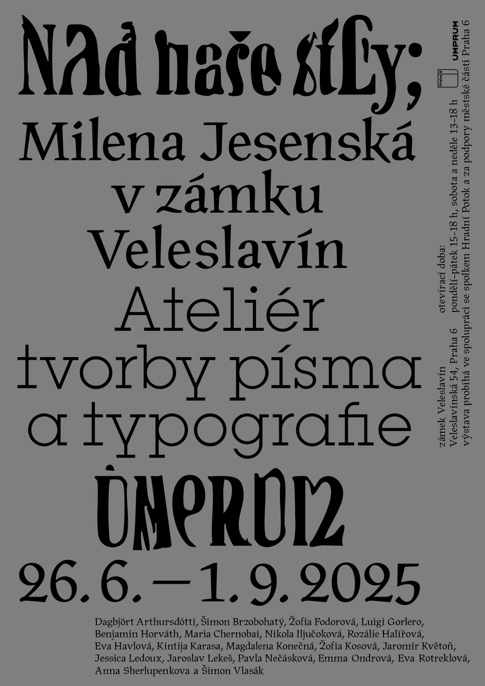 Na výstavě Nad naše síly ve výstavních prostorách zámku Veleslavín, můžete vedle textů Mileny Jesenské věnovat pozornost také písmu. Všechny texty jsou vysazeny fonty, které navrhli studující ateliéru Tvorby písma a typografie na Vysoké škole uměleckoprůmyslové v Praze. Instalace představuje výběr dvaceti pěti autorských písem, která vznikla jako školní práce v ateliéru během posledních pěti let. Ateliér tvorby písma a typografie na pražské UMPRUM je studijní obor a tvůrčí kolektiv, který se zaměřuje na různé přístupy ke zkoumání a práci s médii založenými na textu a písmu. Studující se mimo jiné zabývají zkoumáním písmových forem a tvorbou vlastních digitálních fontů. Součástí výstavy jsou také ukázky autorských knih, odborných publikací a plakátů, které mapují tvorbu studentů a nedávné dění v ateliéru.