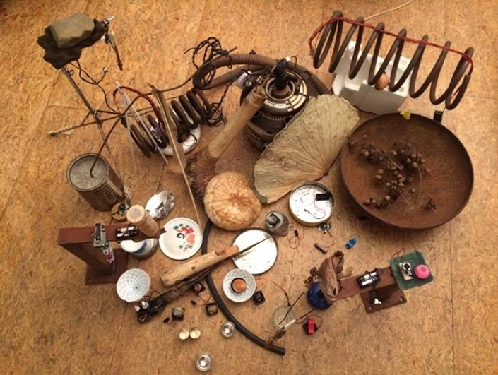 „Plechovky, píšťalky, péra a pružiny, porcelánové mísy, zvonky, pingpongové míčky, suché listy agáve, houbičky, ocelový drát, větve, papírové fólie, plastové tašky, hliníková fólie, růžové rukavice, klavír, balónky, košíky, peří, voda, odpadky, mušle, květináče, kytara, kovové trubky, semena stromu paulovnie, korále, bambusové hole, dřevo, kosti, kameny, filtry…“
