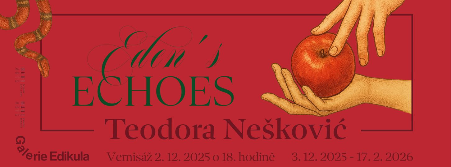 Eden’s Echoes vypráví příběh prvotního hříchu proměněný v současnou zkušenost: v intimním prostoru galerie se zde setkává světlo a stín, krása i nebezpečí, nevinnost i pád. Instalace propojující dřevo, textil, sochy i poezii vytváří prostředí, které zve k tiché sebereflexi a odkrývá fluidní povahu identity. Klíčovým tématem je ženství a jeho napětí mezi očekáváními, která společnost ženám přisuzuje, a jejich vlastní autonomií – symbolizované Evou, hady a růžemi, stejně jako červenými šaty oscilujícími mezi půvabem a hrozbou. Zároveň však výstava překračuje rámec ženského prožitku a obrací pozornost k univerzální zkušenosti proměnlivého já, které se rozprostírá mezi mnoha póly. Každý návštěvník se tak může stát spolutvůrcem příběhu, v němž znovu objevuje, kým je.