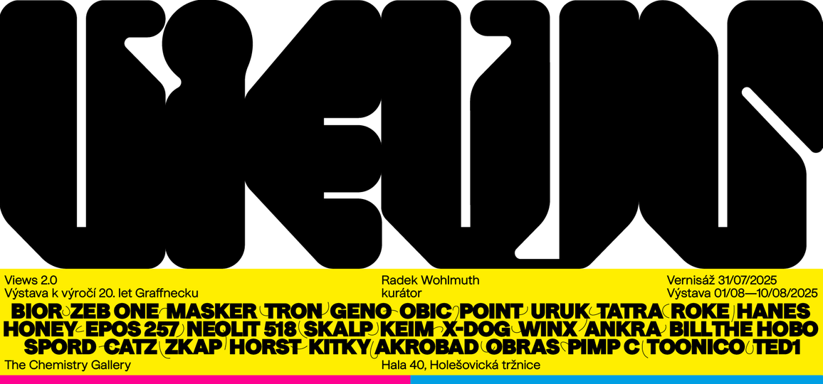 Výstava Views 2.0 představuje vizuální dialog mezi minulostí a současností, mezi ulicí a galerií, mezi subkulturním projevem a obecným výtvarným diskurzem. Sdružuje autory, kteří jsou ukotvení v graffiti komunitě, ale jejich práce přerostla hranice tagů, throw-upů i pieců a transformovala se do volného umění s individuálním rukopisem. Views 2.0 je o pohledu — na město, na tvorbu, na vlastní pozici v kontextu dnešní vizuální kultury. Zároveň ale odkazuje k tradičnímu termínu „view“ jako reflexi stylu, identity a respektu napříč scénou.